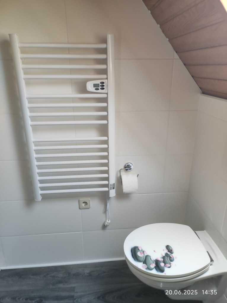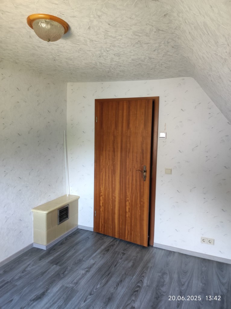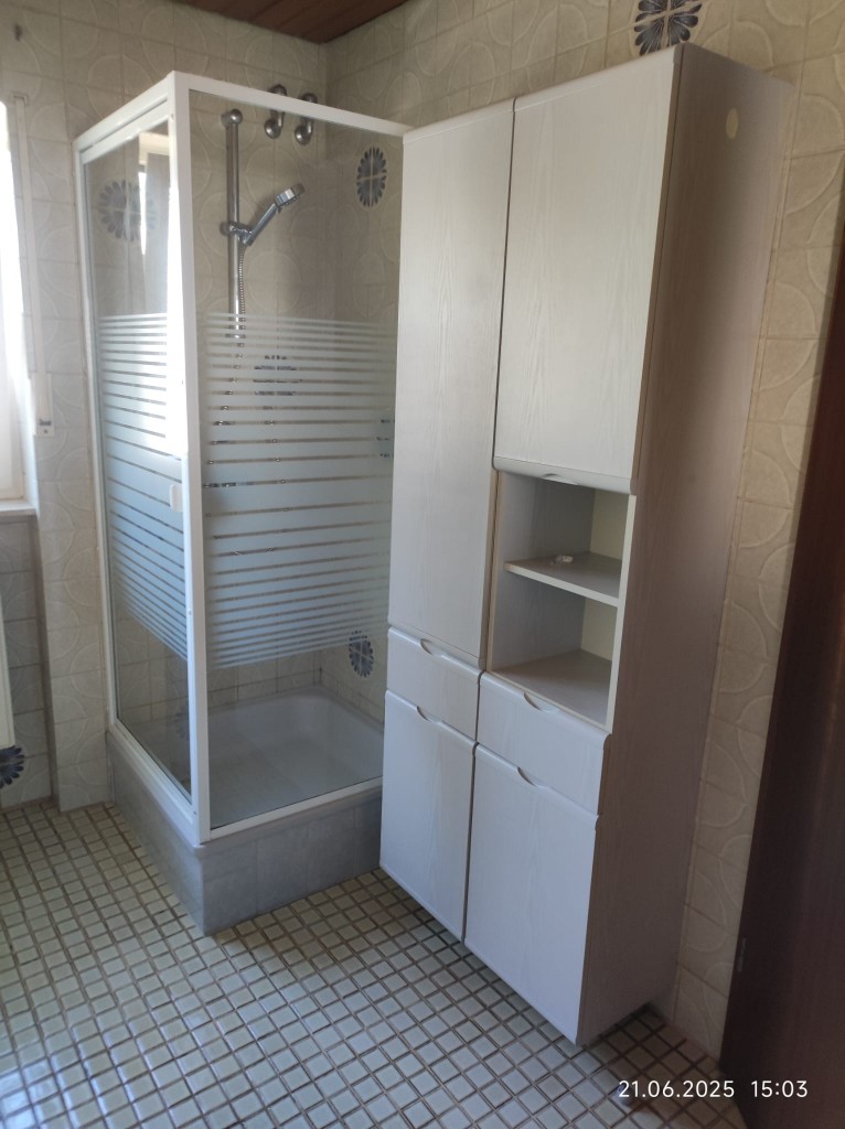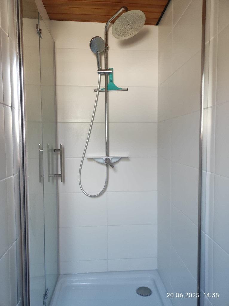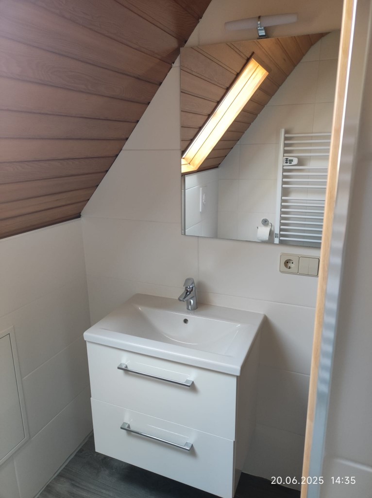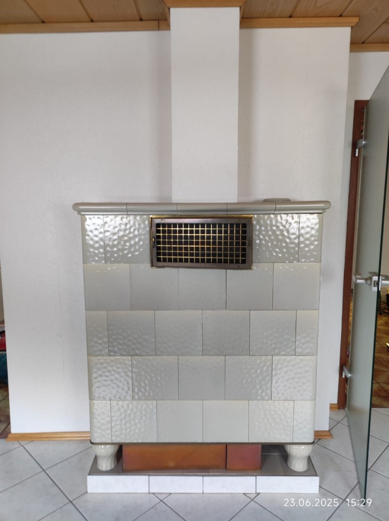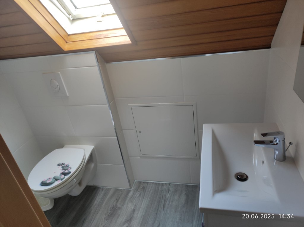 Der Warmluftschacht des Kachelofens führt zu den weiteren Schlafräumen. Das Badezimmer umfasst ein WC, einen Waschtisch und eine Dusche.