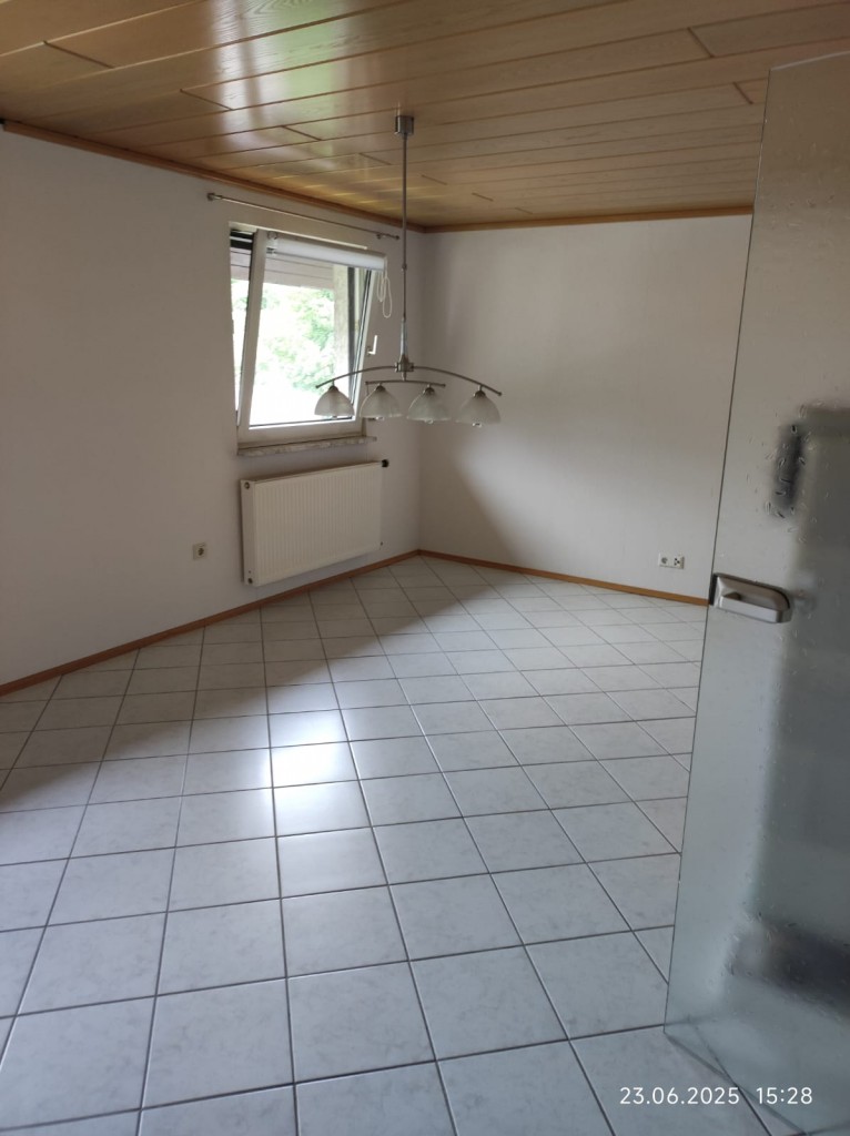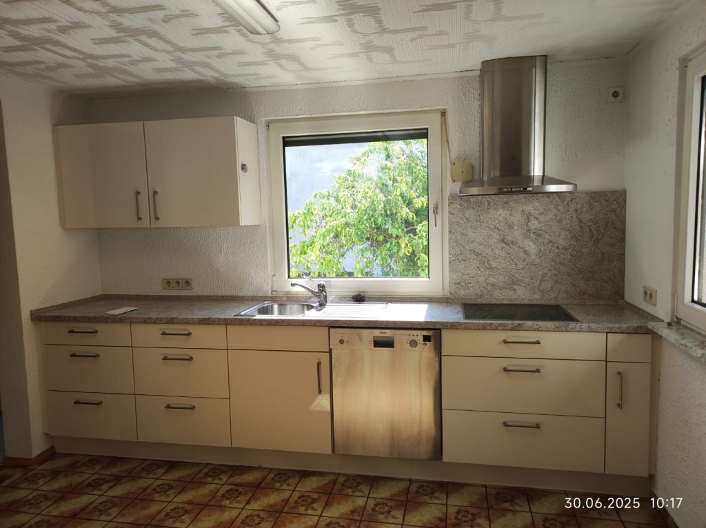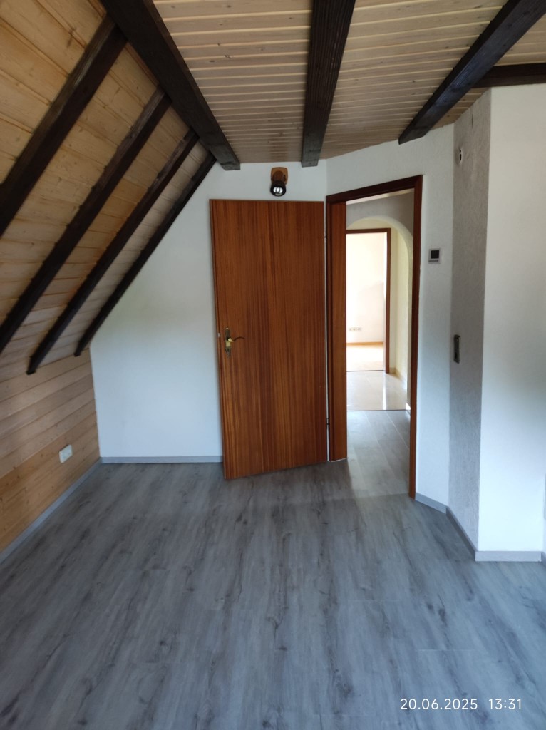 Das Erdgeschoss umfasst ein Badezimmer, ein Esszimmer und eine Einbauküche mit einem Kachelofen, der als unterstützende Heizung genutzt werden kann.